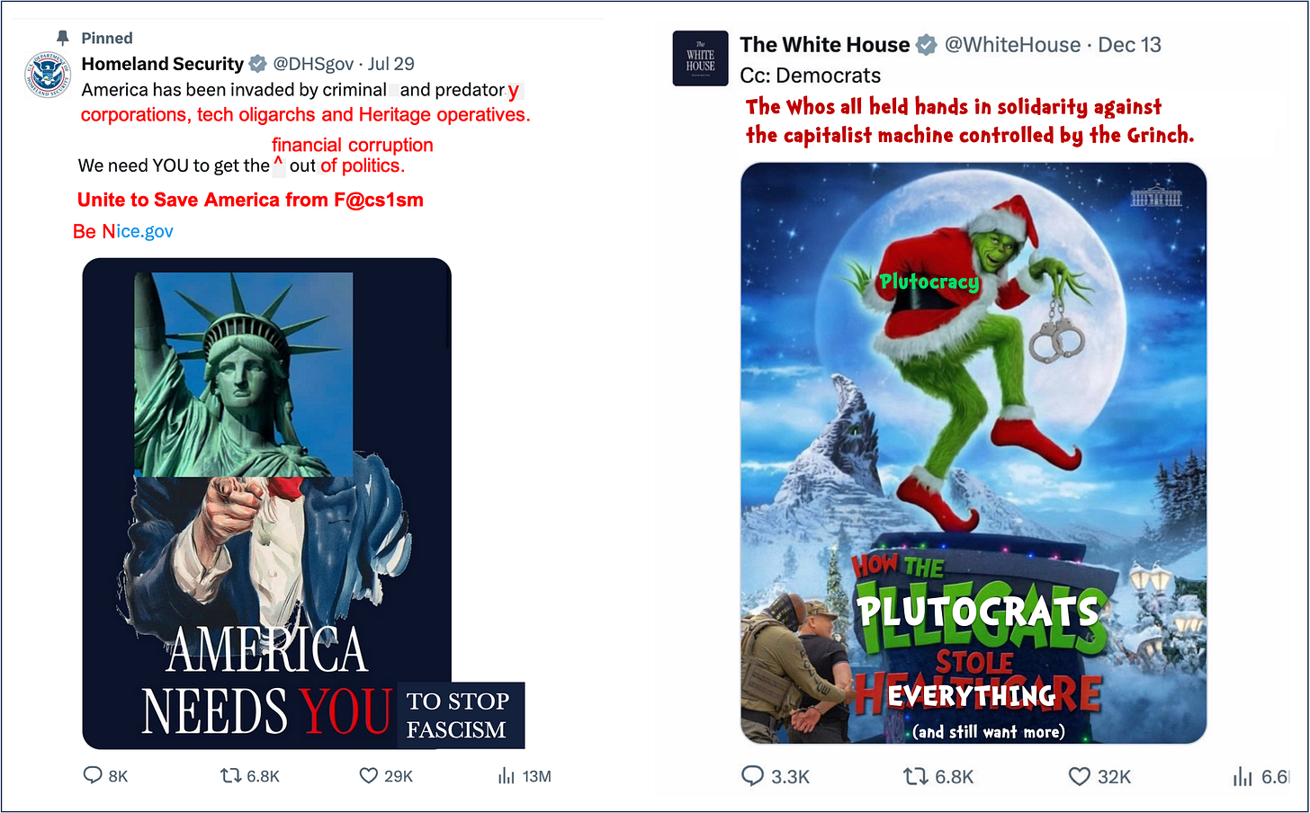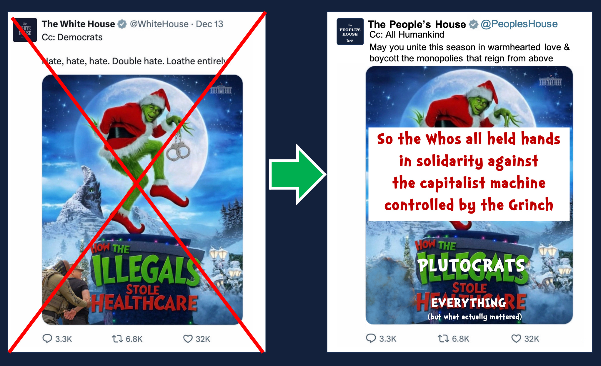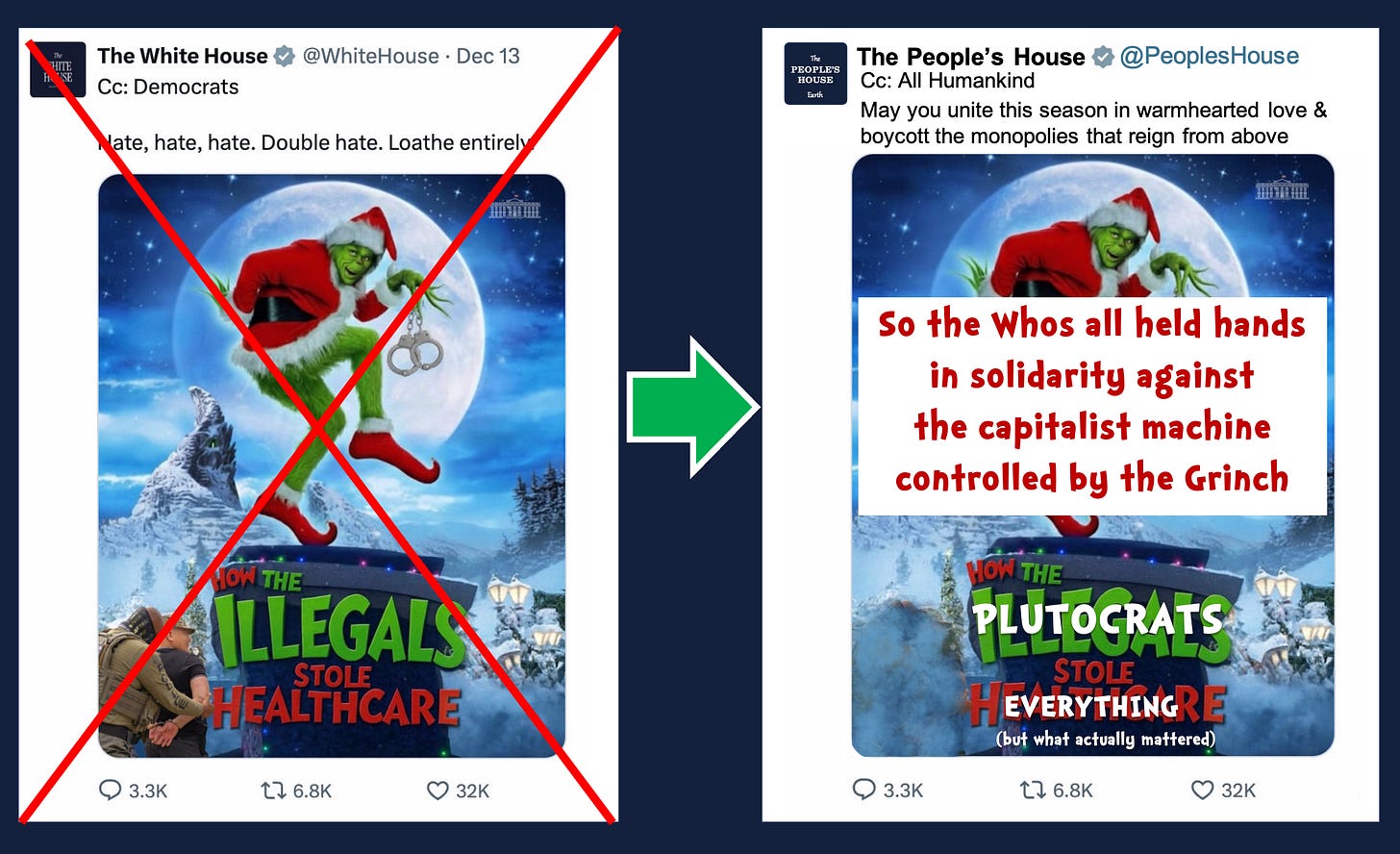 Yes, awareness matters. The DHS pinned post on X and the White House’s recent Grinch tweet were both powerful data points that helped people register the depth of America’s moral unravelling. But sharing deranged propaganda from political figures without strategic re-framing, again, just amplifies it.