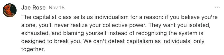 And it doesn’t have to always be complex. This simple note by Jae Rose in just a few lines calls out the depravity of capitalism while also pointing to the answer, leaving the reader with a sense of hope and unity rather than deflated.