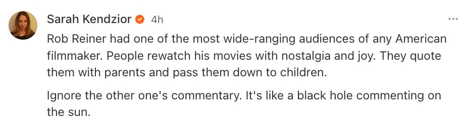 Take Sarah Kendzior’s post about Rob Reiner as a model of a more helpful approach. Rather than detailing or arguing with the grotesque commentary circulating on social media, she simply honored Reiner’s legacy with reverence and then briefly called out the depravity for what it was without bringing it into our collective consciousness in a way that dismisses it as not even worthy of attention.